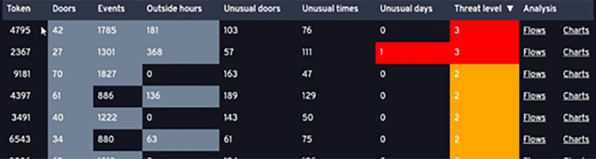 - Poikkeava ovitapahtuma. Tässä tapauksessa yksittäisen käyttäjän käyttämä ovi on poikkeava verrattuna siihen, mitä ovia kyseinen käyttäjä tyypillisesti käyttää. Tähän poikkeavuuteen voi liittyä myös niin sanottu ”no access” tapahtuma, jossa poikkeava ovitapahtuma koskee ovea, johon käytetyllä kulkutunnisteella ei ole kulkuoikeutta.