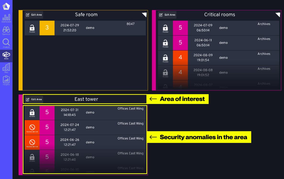 The Area Analysis feature empowers organisations to monitor critical spaces with greater precision, allowing for swift detection of any suspicious activity. By shifting the focus from access token patterns to area-based monitoring, organisations can more effectively identify potential breaches or unauthorised access, ensuring that critical spaces remain protected and enabling immediate mitigation actions when necessary.